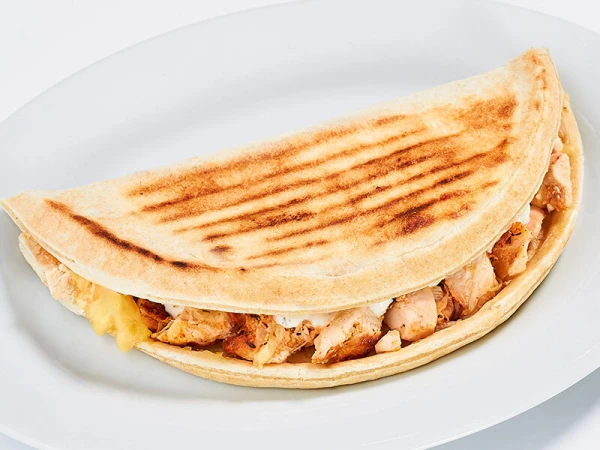 Лаваш, измельченный шашлык из курицы, помидоры, огурцы, перец болгарский, лук с зеленью, маслины, сыр сиртаки, соус бальзамический, пп соус