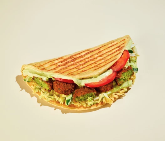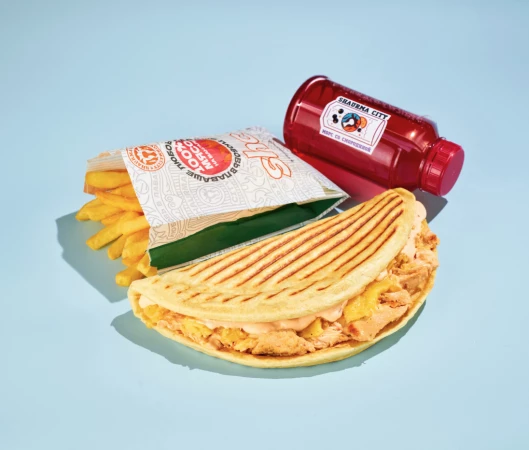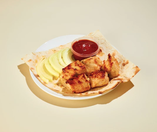 Лаваш, измельченный шашлык из курицы, помидоры, огурцы, перец болгарский, лук с зеленью, маслины, сыр сиртаки, соус бальзамический, соус фирменный